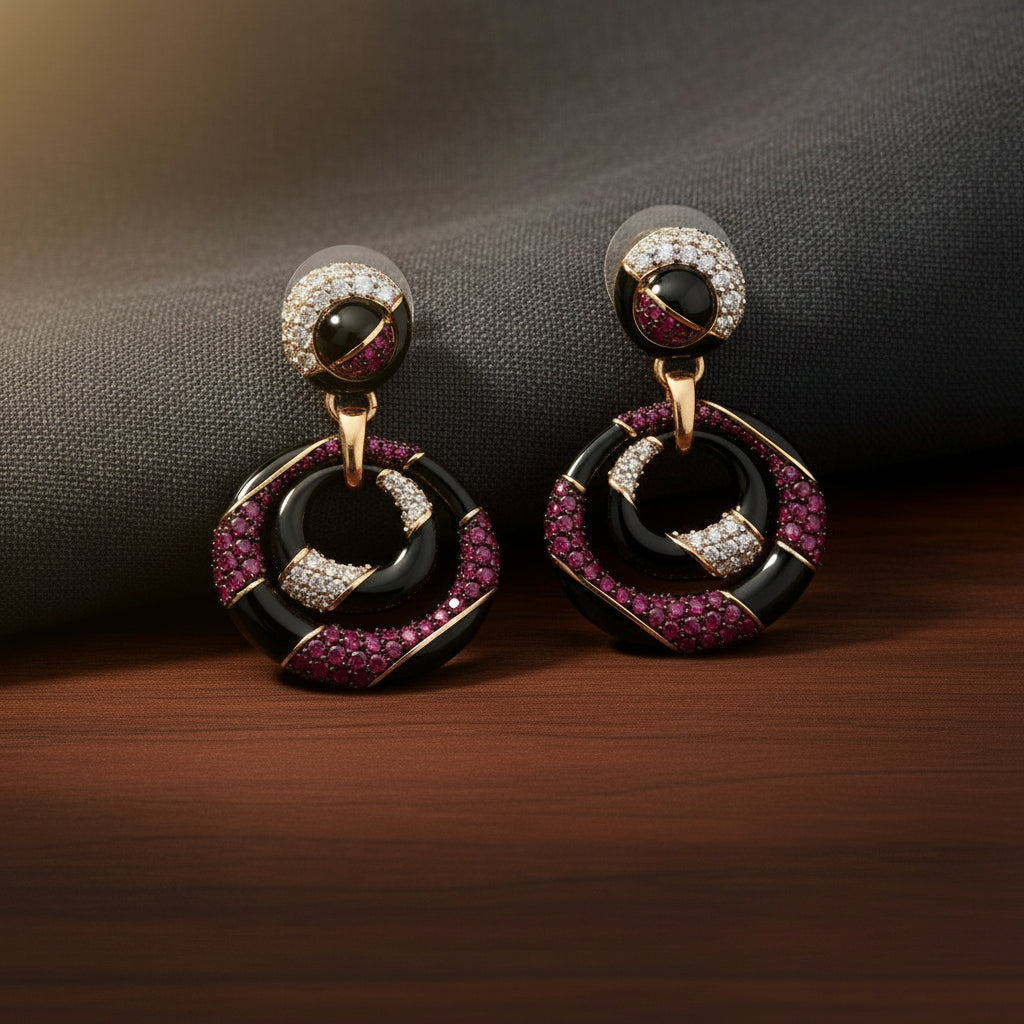 Striking circular drop earrings featuring glossy black enamel accented with shimmering cubic zirconia. The intertwined swirl design, finished in warm gold-toned metal, creates a bold yet elegant look—perfect for adding a touch of sophistication to any outfit.