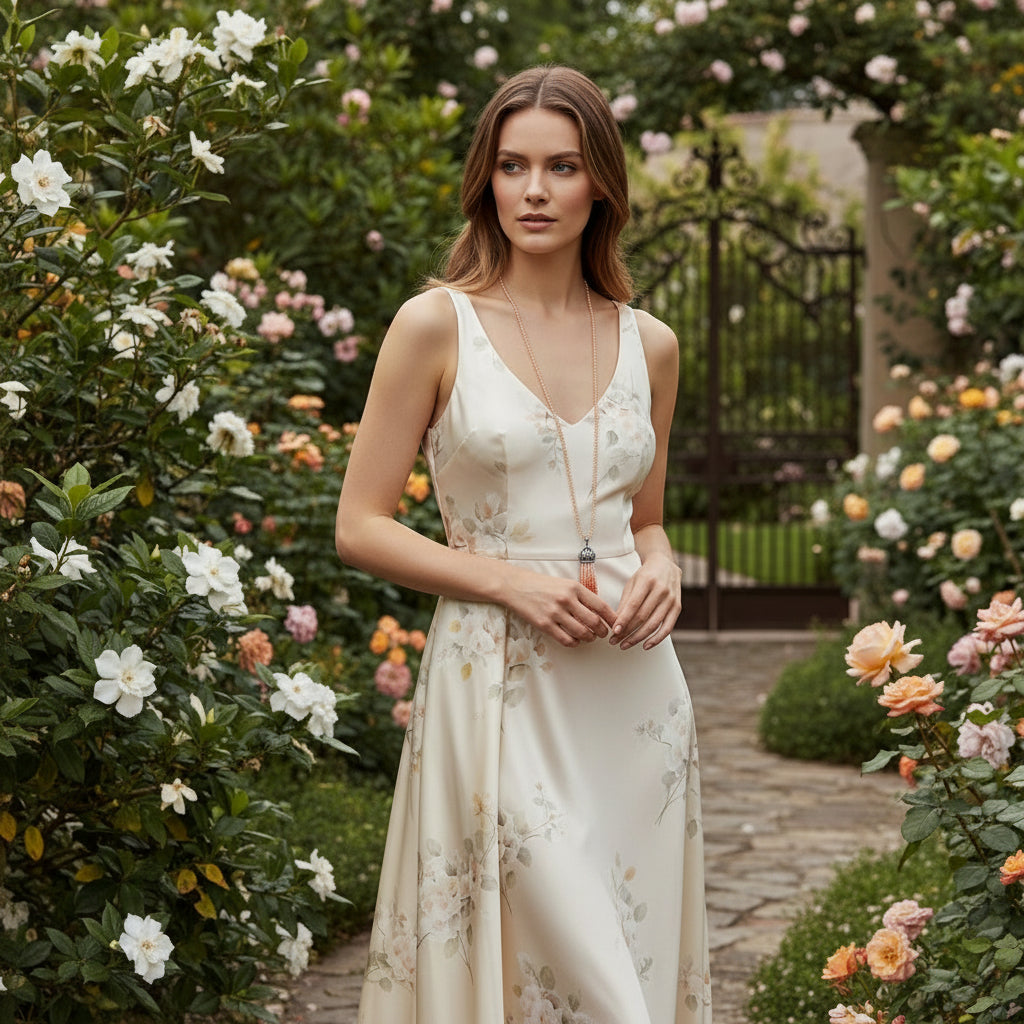 This elegant necklace features multiple strands of soft peach beads cascading into a lush, ombré tassel. The tassel is crowned with a striking black-and-silver crystal-studded cap, adding a touch of shimmer and sophistication. Long and fluid, this piece offers a chic, bohemian-meets-luxury aesthetic—perfect for elevating both casual and formal outfits.